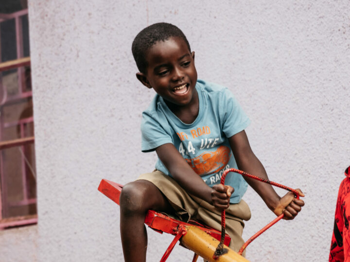 En pojke som heter Godfrey Luyinda som gungar på en gungbräda och skrattar.