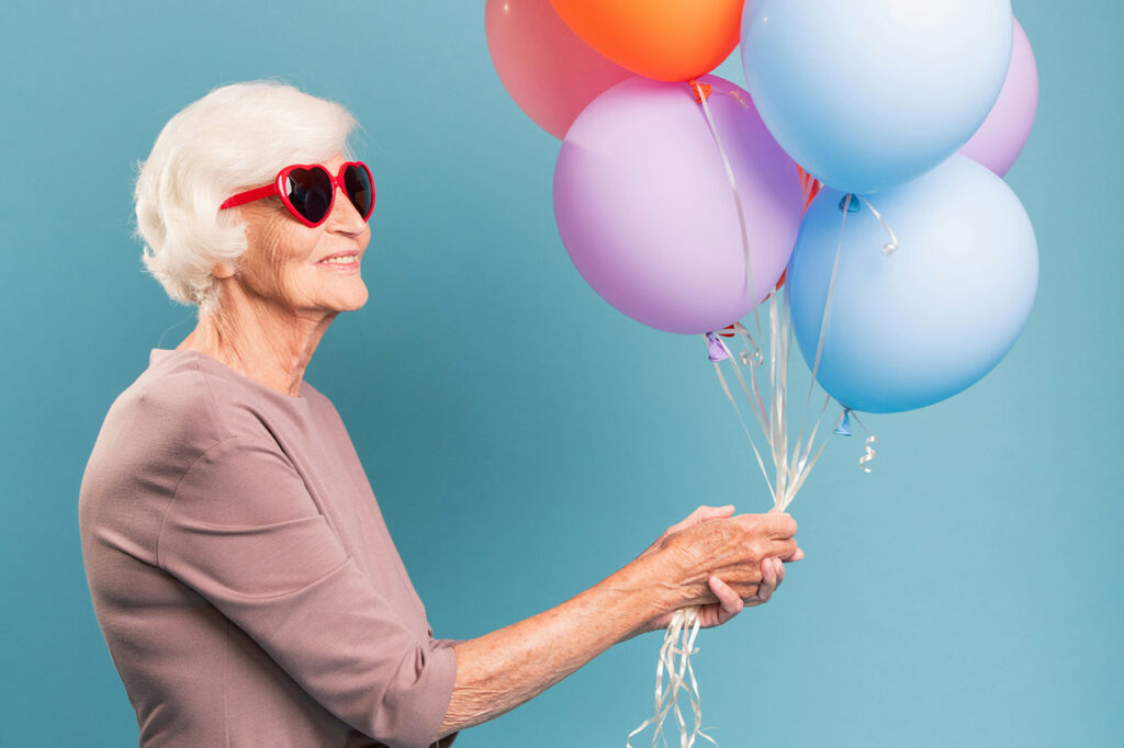En dam klädd i orange skjorta och orangea solglasögon står framför en orange vägg.