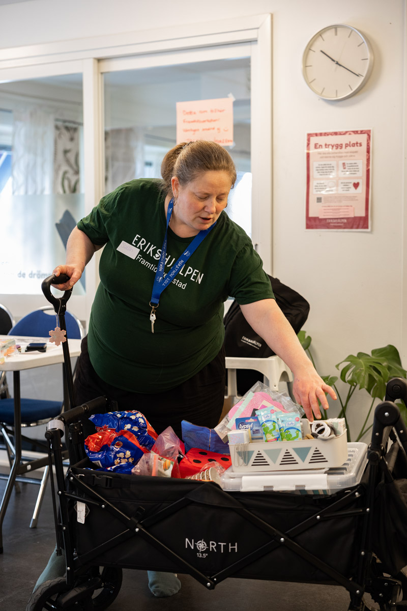 – Vagnen var det första vi köpte, berättar Sarah och visar stolt upp skrindan fylld med nödvändiga saker som tandkräm, reflexer, pappershanddukar och små hygienartiklar. Saker som skänkts av företag eller köpts in till bra pris.